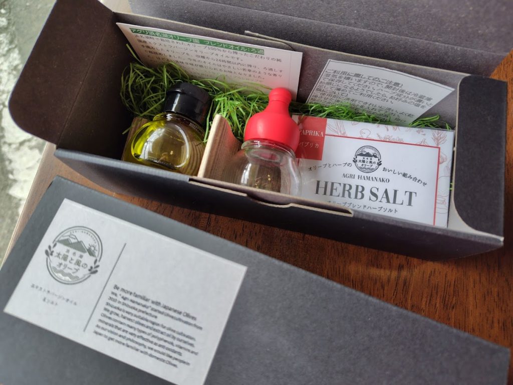 2025年11月22日 / 最終更新日時 : 2025年11月22日 アグリ浜名湖 NEWS 塩とオイル 浜名湖オリーブオイル30mlと オリーブリーフ入りハーブソルトの組合せ ハーブソルトは徐々に皆様にリピートして頂いている 隠れた?人気商品 是非オリーブオイルとともに楽しんでください。 ちょっとしたギフトにも最適です。